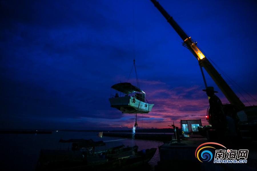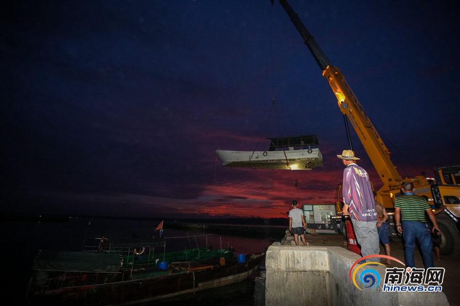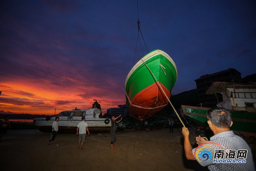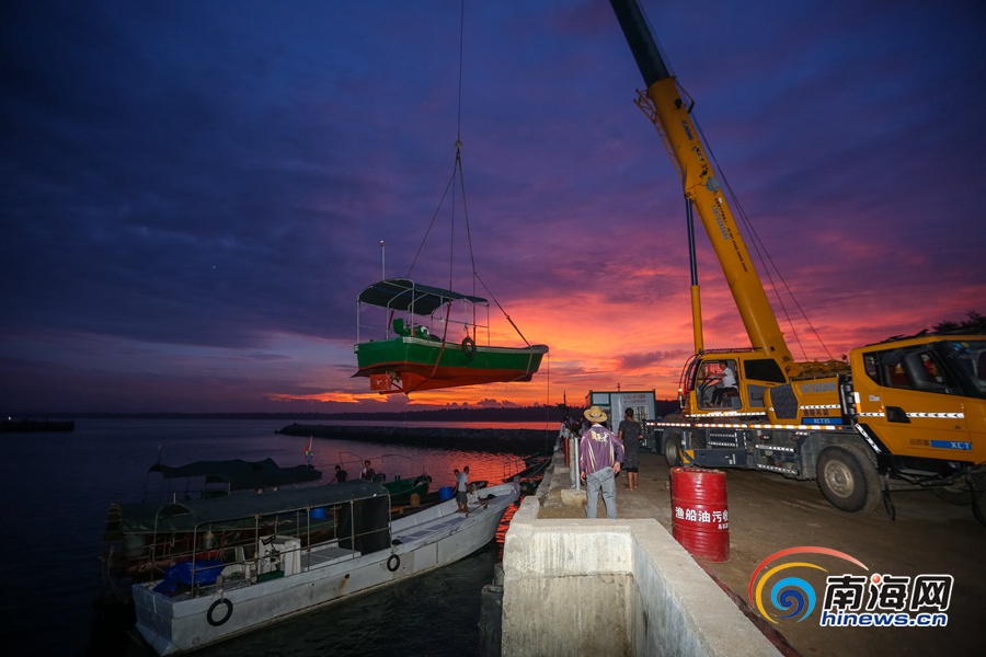 海南旅游頭條、南海網、南海網客戶端萬寧8月28日消息(海報集團全媒體中心記者 袁琛)8月28日,位于萬寧市的烏場港碼頭,起重機把一艘艘漁船吊上岸避風。