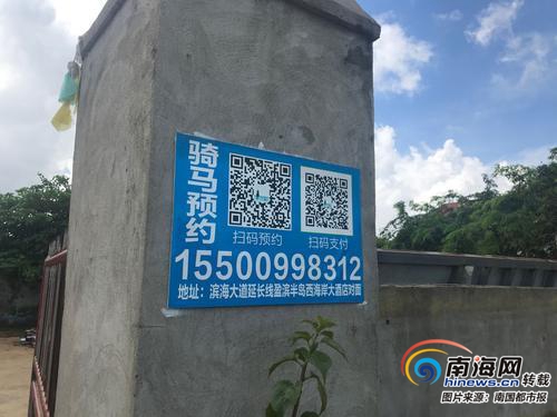 8月28日上午,記者走訪了位于盈濱半島的該馬場發現,該馬場當天沒有消費者在騎馬,僅有一名馬師正在遛馬,并在遛完后將馬趕回道路對面的一處馬圈。記者注意到,無論是馬場還是馬圈,現場確實沒有任意一處寫有該公司名稱的招牌,僅在馬圈門口兩側的門柱上貼有“騎馬預約”字樣的藍色牌子,并附有“掃碼預約”及“掃碼支付”的兩處二維碼及一個聯系電話。