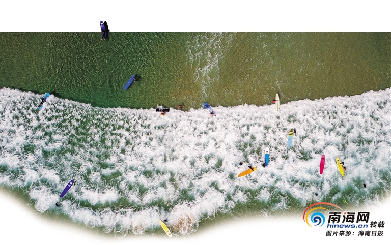 萬寧日月灣,游客在浪尖跳躍、沖刺,展示矯健身姿,享受假日時光。 海南日報記者 袁琛 攝