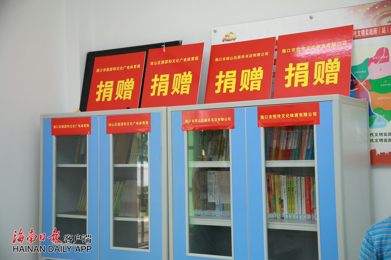 ↑社會各界愛心人士為海口市瓊山區(qū)紅旗鎮(zhèn)本務(wù)村贈送圖書。