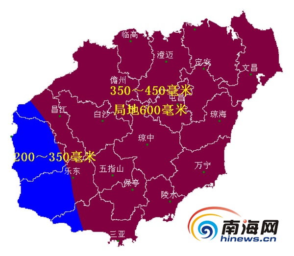 預計,9月3日08時~7日08時各地過程雨量,海口、定安、澄邁、文昌、瓊海、萬寧、臨高、儋州、屯昌、瓊中、白沙、昌江、陵水、三亞、五指山和保亭等市縣350~450毫米、局地600毫米;樂東和東方200~350毫米。