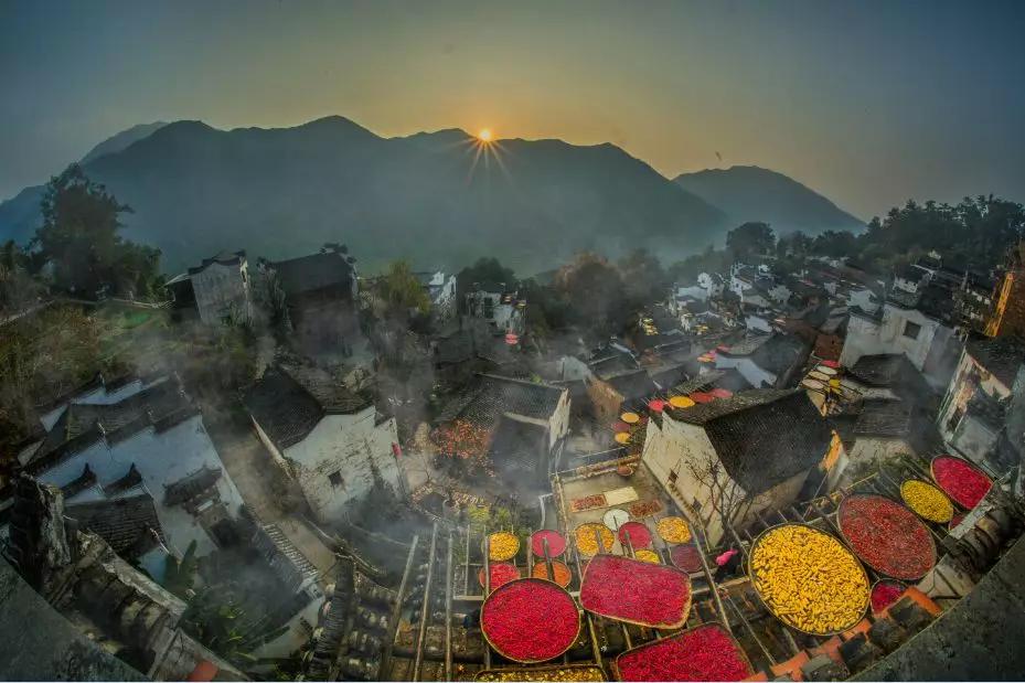 Tips:篁嶺屬典型山居村落,數百棟微派古宅圍繞水口呈扇形梯狀錯落排布,梯田疊翠鋪綠,村莊聚氣巢云,被稱為“梯云人家”。微派民居特色的白墻黑瓦飛檐鑲嵌在青山碧水間,余煙裊裊,描繪出一幅山里人家風情畫卷。放眼望去,日出山谷,斜陽朗照,古村家家戶戶晾出曬秋竹制簸箕,曬滿了辣椒、夏菊、玉米、稻谷等五顏六色農作物,閃耀著象征豐收的色彩,美不勝收。