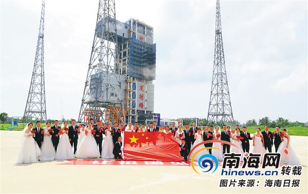 當天上午,在文昌航天發射場火箭總裝測試廠房內,20多對新人一齊揮動五星紅旗,共同唱響歌曲《我和我的祖國》,向祖國告白,為祖國祝福。據悉,長期以來,文昌航天發射場官兵扎根海南、奉獻青春,為國家作出了很大貢獻。