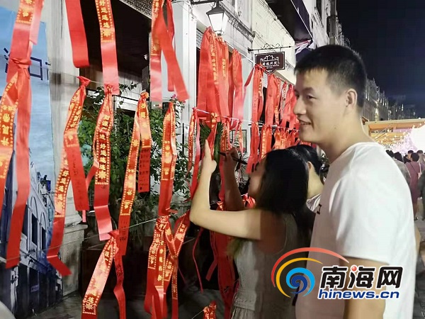 游客將紅絲帶掛在祈福墻上。南海網記者 蘇靚 攝