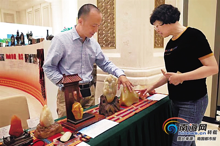 11件作品和原石與沉香、黎錦等一起呈現在國內外30家媒體、84名中外媒體記者面前。這是昌江首次在國家重大平臺上代表海南展示“美好新”的海南形象。