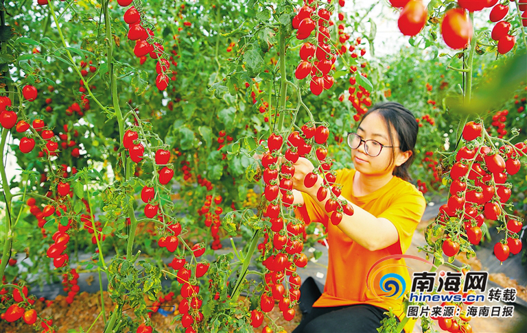 海南和豐世紀(jì)農(nóng)業(yè)開(kāi)發(fā)有限公司育苗中心試驗(yàn)大棚內(nèi),技術(shù)員在觀察小番茄長(zhǎng)勢(shì)。海南日?qǐng)?bào)記者 蘇曉杰 通訊員 楊耀科 攝