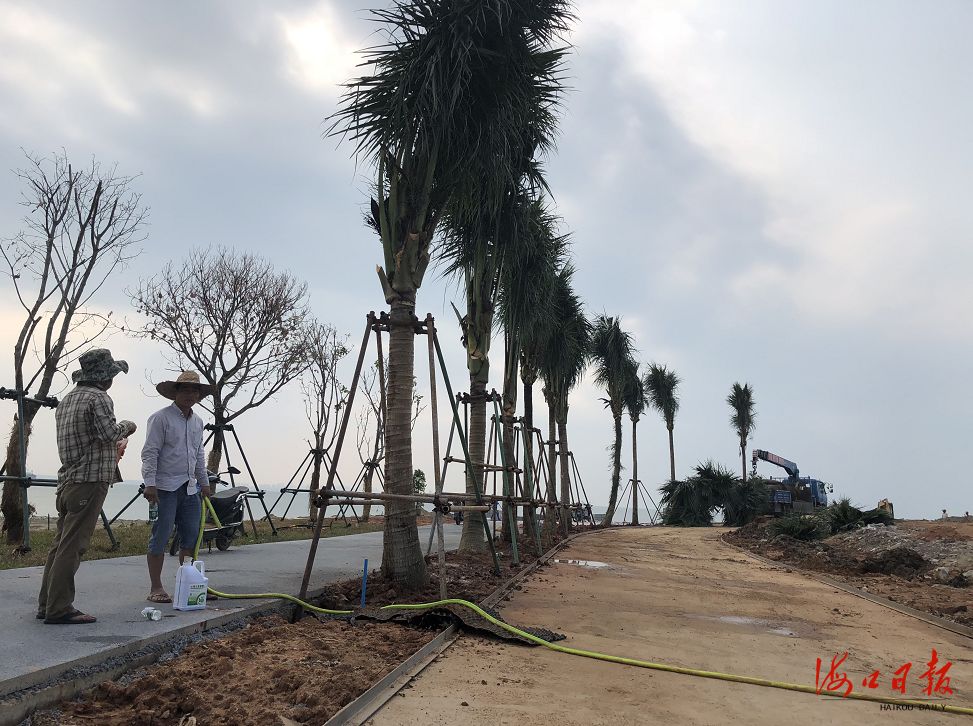 為了提升景觀,施工方還在三道旁種植了椰子樹、大葉欖仁、小葉欖仁等,在建設(shè)景觀綠化工程時,按照“鄉(xiāng)土特色,簡約大方”的原則,因地制宜廣泛種植了椰子樹、大葉油草,適度種植了三角梅。