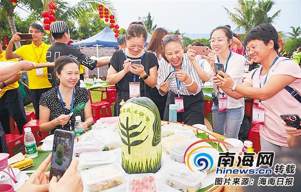 我省“中國農(nóng)民豐收節(jié)”慶祝活動(dòng)三亞主會(huì)場(chǎng),特色豐富的公道飯吸引市民游客拍照留念。見習(xí)記者 封爍 攝