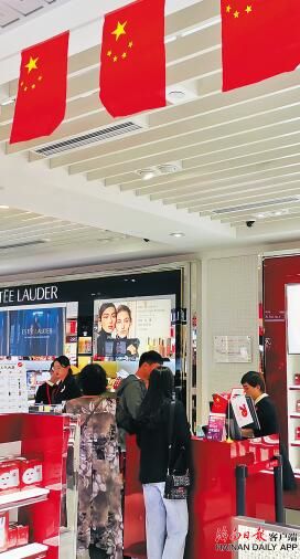 10月4日,在海口美蘭國(guó)際機(jī)場(chǎng)免稅店,旅客正在選購(gòu)商品。(海南日?qǐng)?bào)記者 王凱 攝)