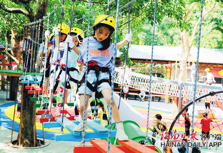 10月3日,小游客在海口火山口地質(zhì)公園親子樂園體驗(yàn)火山攀爬體驗(yàn)、空中叢林穿越等游樂項(xiàng)目。(海南日?qǐng)?bào)記者 張茂 通訊員 熊麗 攝)