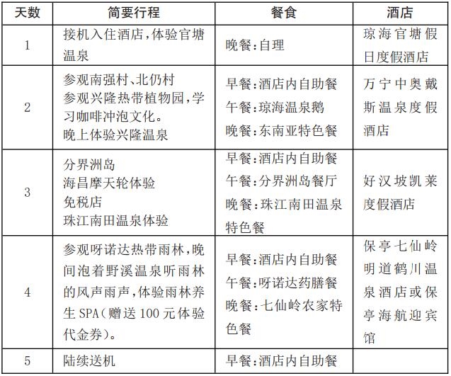海口騎樓老街民宿→品嘗海南美食→海口觀瀾湖旅游度假區(qū)→火山巖礦溫泉主題公園→瓊海白石嶺旅游景區(qū)→瓊海官塘溫泉→博鰲水城旅游景區(qū)→萬(wàn)寧石梅灣→萬(wàn)寧興隆溫泉度假區(qū)→萬(wàn)寧興隆熱帶植物園