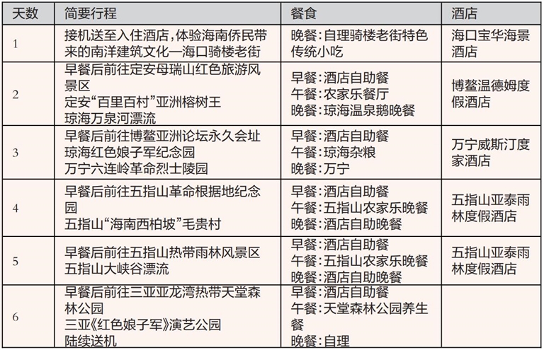 海南省博物館→??隍T樓老街→海口馮白駒故居→定安母瑞山紅色旅游風景區→定安“百里百村”亞洲榕樹王→瓊海萬泉河漂流→博鰲亞洲論壇永久會址→瓊海紅色娘子軍紀念園→萬寧日月灣沖浪→萬寧六連嶺革命烈士陵園→五指山革命根據地紀念園→五指山毛貴村→五指山熱帶雨林風景區→五指山大峽谷漂流→三亞《紅色娘子軍》演藝公園→三亞亞龍灣熱帶天堂森林公園