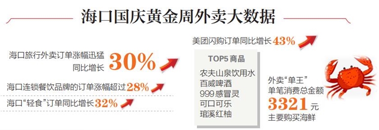 放眼全國,深圳成為國慶假期期間外賣訂單量最高的城市,北京位列第二,廣州、上海、成都緊隨其后,均為熱門旅游城市。目光回到海南,海鮮、海南粉、椰子飯、海南雞飯等代表海南地方特色的小吃,則是游客在逛??跁r(shí)下單最多的菜品。