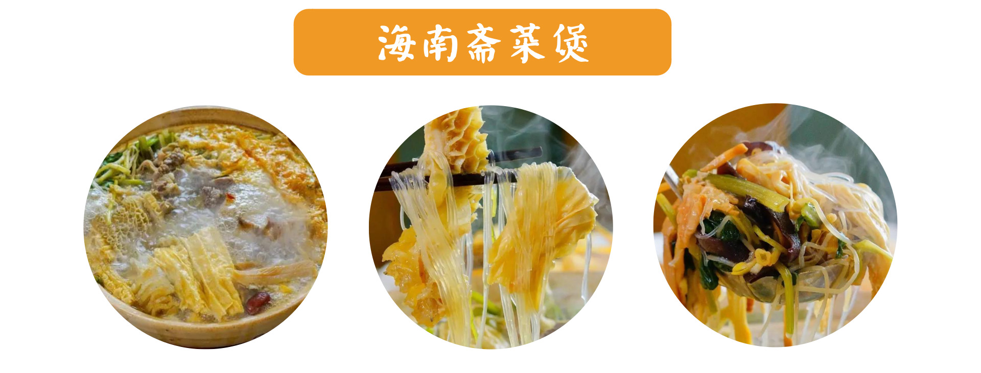 齋菜,原為道家、佛家烹飪,以三菇六耳、瓜果蔬茹及豆制品為主,故又稱“寺院菜”、“素菜”,最大特點是不使用動物性原料,連大蒜、坡芹、咸菜等一些植物性原料也在禁用之列。齋菜煲的原料全為素菜,但味道卻異常鮮美。近年來,由于素菜具有的養生功效和獨特口味,在海南美食屆,大受吃貨們歡迎。