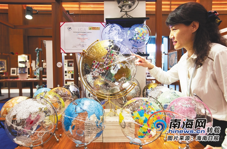 海南書博會主打“旅游牌”,中國地圖出版集團等與旅游緊密相關的出版機構帶著最新最全的產品大展風采。透明的亞克力地球儀中包裹著世界多個國家的國旗標志,據介紹,這款地球儀產品榮獲了測繪界最高獎項國際制圖大會頒發的銀獎。