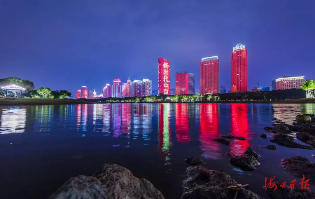 濱海大道燈光秀倒映在萬綠園人工湖中,如夢如幻。海口日報記者 蘇弼坤 攝