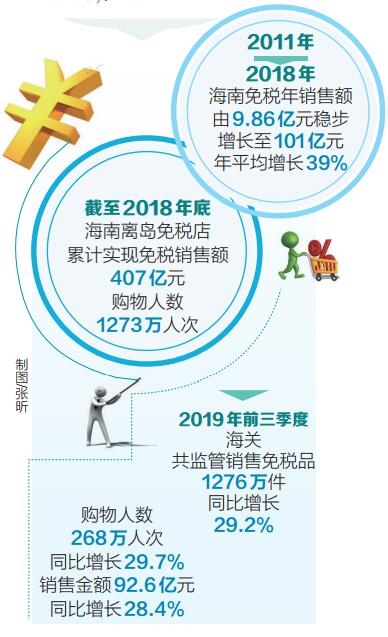 如何將更多的消費及資金留在國內?在對這一問題的回答中,離島免稅政策發(fā)揮著不可忽略的重要作用。數據顯示,從2011年至2018年,海南免稅年銷售額由9.86億元穩(wěn)步增長至101億元,年平均增長39%;購物人數由48.36萬人次增長到288萬人次。截至2018年底,海南離島免稅店累計實現免稅銷售額407億元,購物人數1273萬人次。