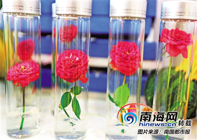 記者看到,一支已然盛放的粉紅色月季花被裝在一個管徑只有3厘米左右的透明玻璃試管中,與其他正常大小的月季花不同,這幾支盛開的月季花花瓣開的最大也只有2-3厘米之間,最小的甚至只有1厘米,看起來袖珍可愛,令人稱奇。