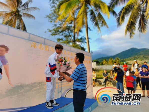 國家沖浪隊領隊兼海南隊主教練馬福來為運動員頒獎。南海網記者韓星 攝