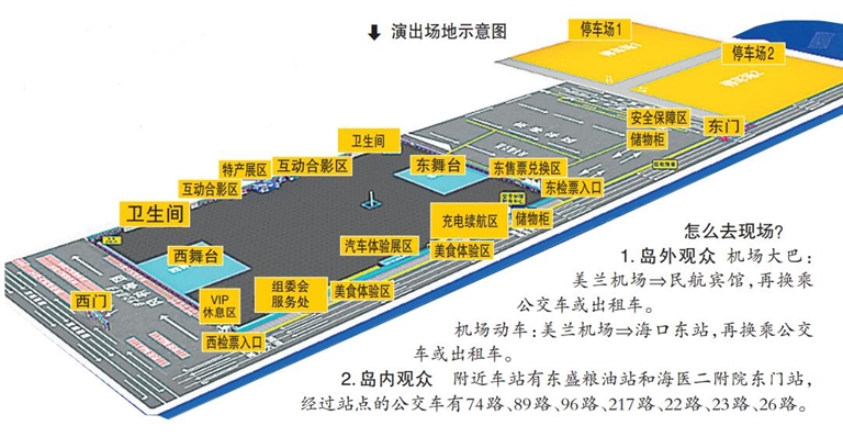 為提升觀眾的消費體驗,活動現場除安排了兩大舞臺外,還將提供先鋒藝術區、汽車展示體驗區、互動合影區、美食體驗區、啤酒體驗區、充電續航區等6大體驗互動及展示區域。在美食體驗區,不僅有海南本土特色美食、特產,還有雞翅包飯、烤串、臺灣烤腸、長沙豆腐、炒栗子等小吃填飽觀眾胃口。