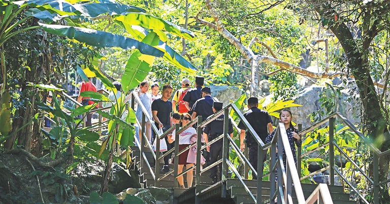 “百花仙境百花開,菩提福地福自來”。瓊中黎族苗族自治縣百花嶺雨林文化旅游區,空中垂下的藤蔓郁郁蔥蔥,新生的蕨類植物攀附在有著“植物活化石”之稱的桫欏樹上,獨木成林的百年榕樹看似與鄰樹相依相偎,卻正悄然爭奪著大地的滋養……當你踏入遮天蔽日的原始熱帶雨林時,一位位游客被完整的熱帶雨林景觀所震撼。