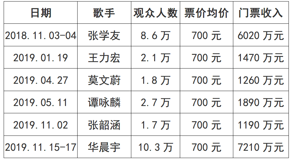 部分海口演唱會(huì)門票收入統(tǒng)計(jì)表