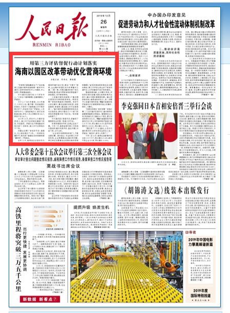 12月26日,《人民日報》頭版頭條刊發(fā)文章《用第三方評估督促行動計劃落實海南以園區(qū)改革帶動優(yōu)化營商環(huán)境》.全文如下: