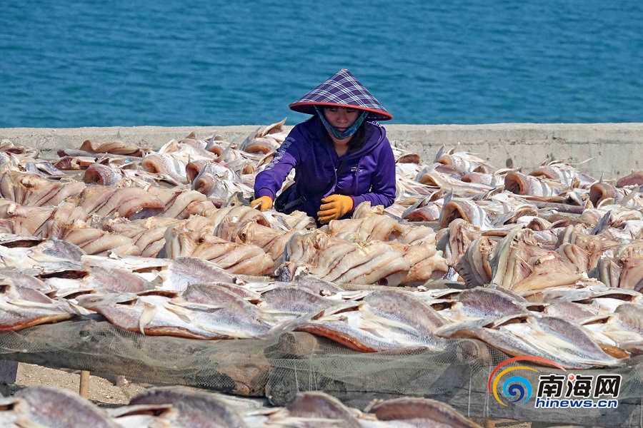 南海網、南海網客戶端儋州1月8日消息(海報集團全媒體中心記者陳元才)近日,在儋州市海頭鎮港口居委會,漁民們忙著晾曬紅魚干。時下正是儋州紅魚生產銷售的旺季,前來訂購帶魚、紅魚等海產品的省內外客戶絡繹不絕。