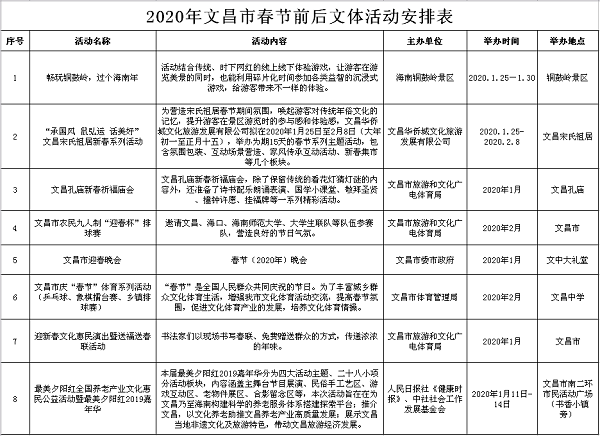據(jù)悉,文昌春節(jié)前后將舉辦8項(xiàng)活動(dòng),既有激烈的排球比賽,也有精彩的迎春晚會(huì),更有獨(dú)具文昌特色的新春祈福廟會(huì)。1月至2月底,這些文體活動(dòng)將接連上演,銅鼓嶺風(fēng)景區(qū)、宋氏祖居、孔廟等地都將加入狂歡的行列。