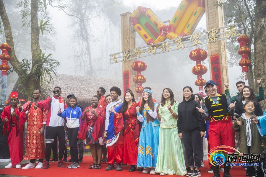 1月12日上午,海南首個雨林高空漂流項目在瓊中百花嶺熱帶雨林文化旅游區正式對外開放。圖為游客和外國留學生一起見證項目啟動。南海網記者 劉洋 攝