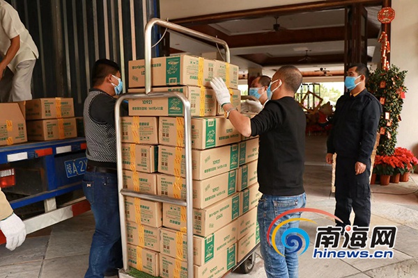 1月31日,南國企業集團董事長劉漢惜早早地來到公司,在他的精心安排下,一箱箱純香椰子粉和薄餅產品被運送上貨車,它們將打包成400份的禮盒發往三亞麗景海灣酒店,通過工作人員轉送到湖北籍旅客手中。