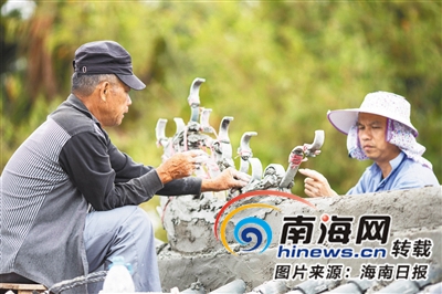 3月3日,瓊海市博鰲鎮留客村蔡家宅文化旅游區暨留客村美麗鄉村建設項目一期施工現場,工人們正在制作民居屋頂的飛檐造型。