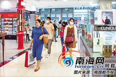 “由于個別化妝品牌店顧客較多,為避免人員聚集,免稅店管理人員在化妝品牌店門口拉起了警戒線,所有前來購買化妝品的顧客需要依序分成兩列,在警戒線外指示銷售人員拿取所需商品,后面的顧客則相互間隔一米以上排隊等待?!比赵聫V場免稅店經理孫麗麗介紹,顧客憑離島機票就可在店里享受低于有稅市場15-35%的優惠,所以前來購物的顧客比較多。
