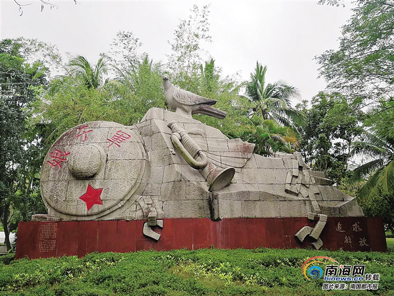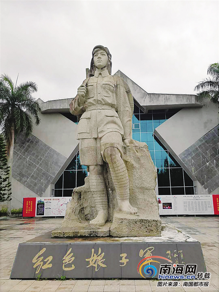 走到紀念館廣場前,有一尊高10米、寬4.5米的紅色娘子軍雕像。這座雕像是采用瓊海市多異嶺上優(yōu)質(zhì)的花崗巖石雕刻的,雕像頭戴八角軍帽,背斗笠,肩扛鋼槍,赤著腳,兩眼炯炯向前,形象逼真。