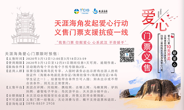 天涯海角游覽區(qū)旺季門(mén)票價(jià)格標(biāo)準(zhǔn)為81元/人,淡季門(mén)票價(jià)格標(biāo)準(zhǔn)為68元/人,本次活動(dòng)以10元/人的特惠價(jià)格進(jìn)行愛(ài)心義售,義售所得款項(xiàng)將全部捐助武漢地區(qū),用于支援抗擊疫情一線及在疫情中受影響的家庭。