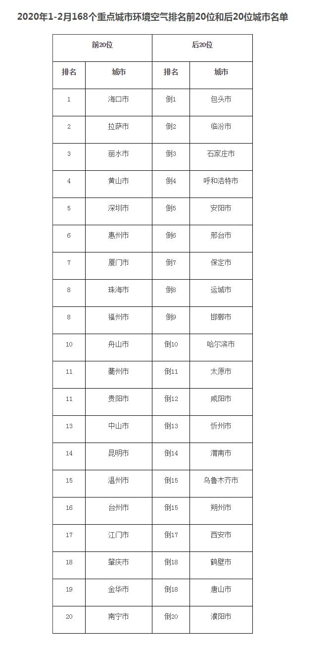2月,168個重點城市中運城、太原、包頭市等城市空氣質(zhì)量相對較差(從倒數(shù)第1名至并列倒數(shù)第20名);拉薩、海口、惠州市等城市空氣質(zhì)量相對較好。