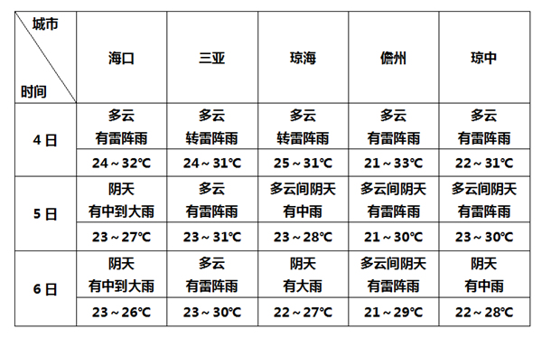 預(yù)計(jì)4日夜間~6日,受弱冷空氣影響,海南島大部分地區(qū)有陣雨或雷陣雨,局地暴雨,其中五指山以北局部地區(qū)伴有雷雨大風(fēng)和短時(shí)強(qiáng)降水等強(qiáng)對(duì)流天氣;各地氣溫下降,6日全島最高氣溫26~29℃,最低氣溫20~23℃。