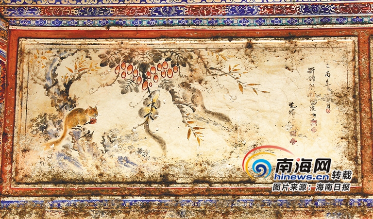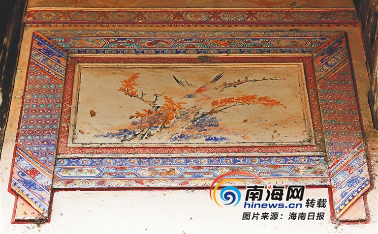 文昌人建造房屋歷來有繪制壁畫的習(xí)俗。彩繪不僅有保護(hù)墻面的作用,更重要的是人們通過豐富多彩的畫像來表達(dá)對美好生活的追求和企盼。林家大院的屋檐下、梁枋間飾有精美的壁畫,以及表現(xiàn)古代名人的詩詞書畫和梅蘭竹菊、花鳥等圖案。有象征喜上眉梢的“喜鵲登梅”;象征高尚品德的松、竹、梅;意喻金玉滿堂的“金魚和海棠”;表示連年有余的“蓮花和鯉魚”等。這些壁畫的色彩雖然有所暗淡,但不剝裂、不脫落,保存較為完整,當(dāng)年的華麗與繁盛依然清晰可見。拂去歲月的塵埃,一幅幅美麗的、充滿鄉(xiāng)愁的山水、動植物彩繪畫卷,給人以清雅、舒適的美感。