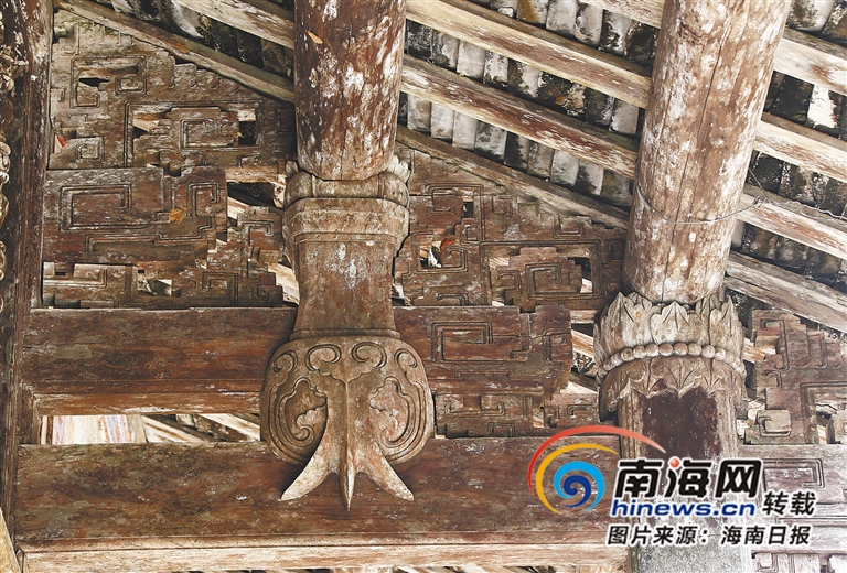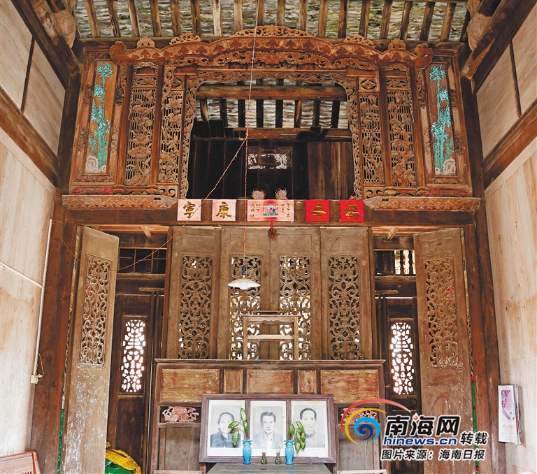 林家大院精致的木雕門、瓦房屋脊的翹頭、屋檐下的精美壁畫和別具一格的彩紋地磚等,體現(xiàn)了較為高超的傳統(tǒng)建筑技藝,堪稱海南古民居的經(jīng)典之作。