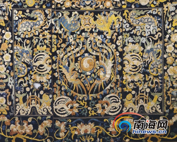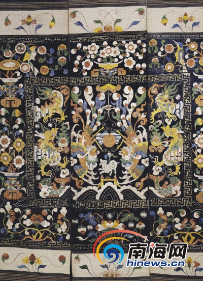 雙鳳日月增輝圖龍被(清中期,海南省博物館藏)通長195厘米,寬122厘米。三幅連綴而成,手工織繡,中間是主體花紋圖案,被分割為兩部分。花紋圖案用黃、綠、褐、紅、白等彩線繡成。“卍”字連續紋帶組成長方形方框把圖案分割為主體花紋和襯托花紋,方框內中間為雙鳳相向太陽和白兔,白兔嘴叼一支桂花象征月亮。雙鳳兩側為相向的雙龍,底下為波濤洶涌的水面,上有龍門和跳起兩條大鯉魚,雙鳳、雙龍、雙魚同朝向日月。框外輔有花瓶內插著梅花、怒放的牡丹和荷花等花卉,在梅花上還有喜鵲落在梅枝上,整幅龍被構圖飽滿,色彩搭配和諧,龍的造型比較矯健,龍鼻大小適當。