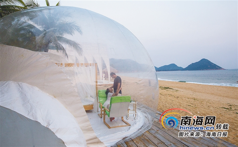 游客在陵水南灣猴島生態(tài)旅游區(qū)二期項(xiàng)目呆呆島的泡泡屋中拍攝寫真。 武昊 攝