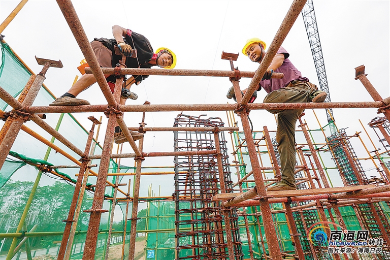 4月30日,在白沙黎族自治縣牙叉鎮茶園路北側的高峰村生態搬遷安置點施工現場,施工人員緊張施工。 海南日報記者 袁琛 攝