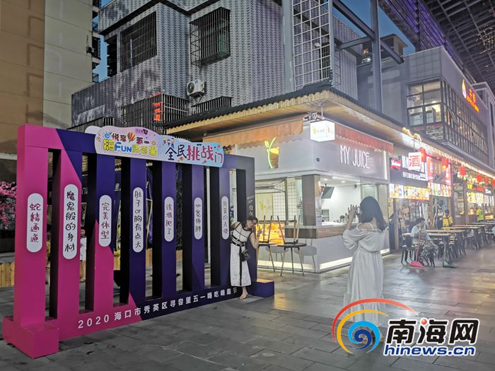5月3日晚,市民游客在海口市秀英區尋嘗里夜市的體型測試門打卡拍照。記者韓星 攝