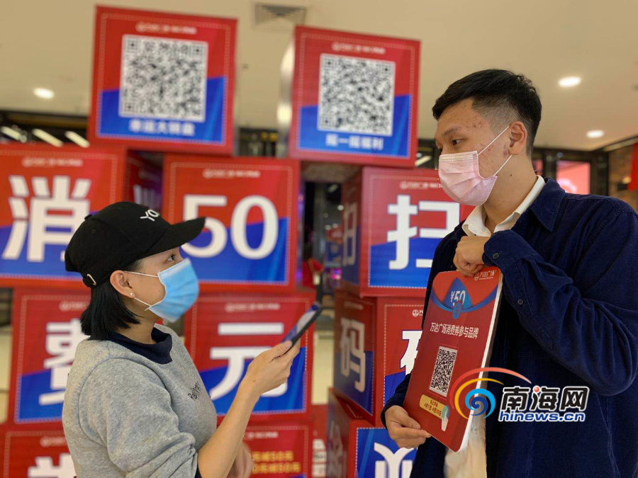 海口秀英萬達購物廣場內,市民正在掃碼領券。海口秀英萬達購物廣場供圖