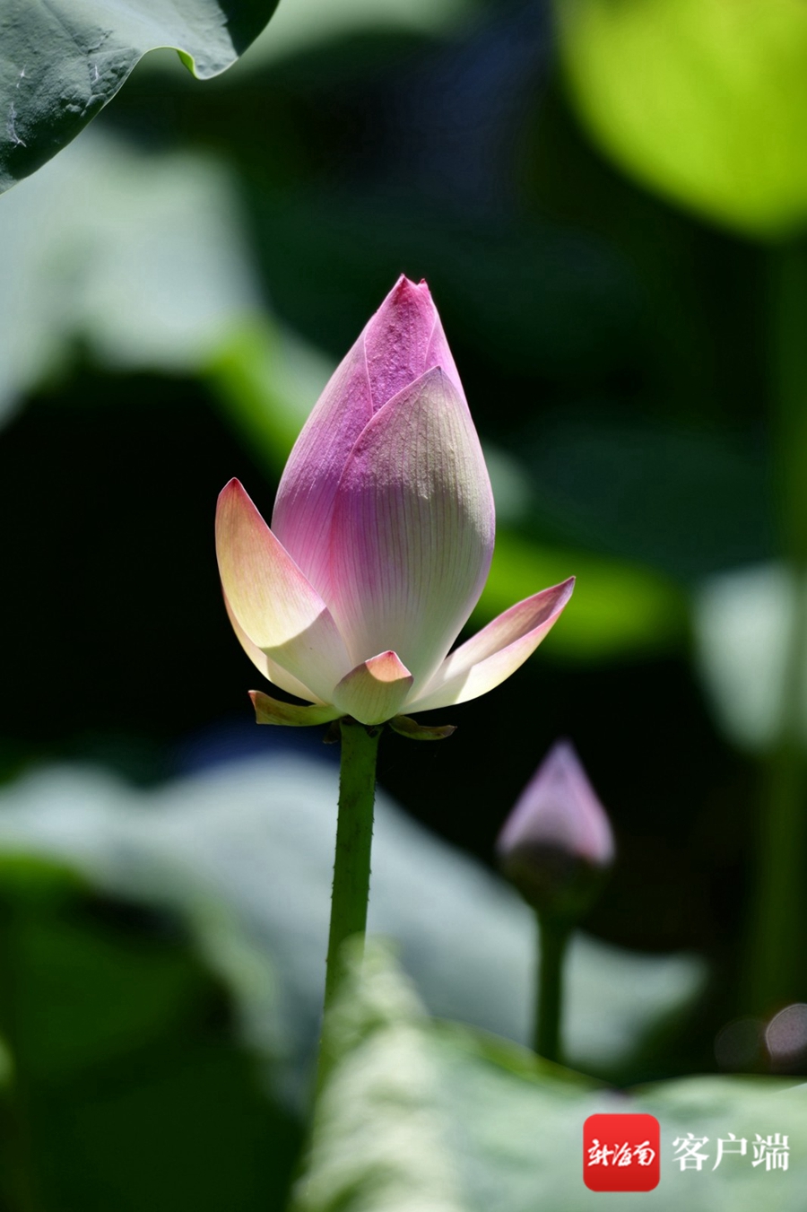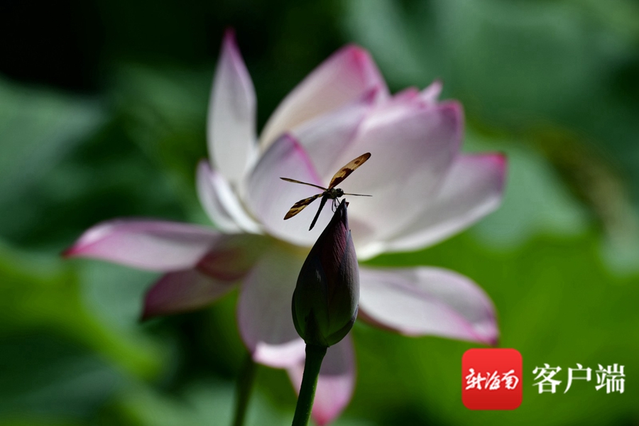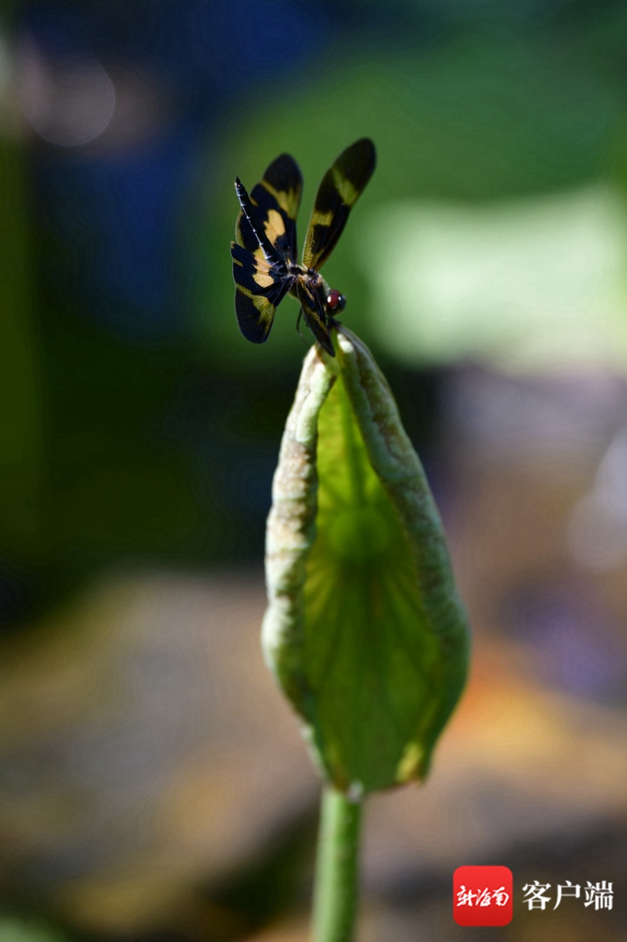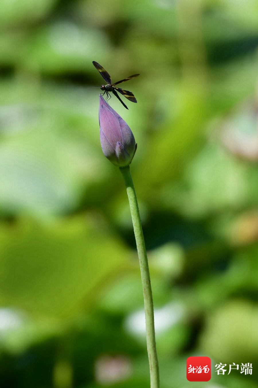近日,海南大學(xué)里荷花池中長(zhǎng)滿了綠綠的荷葉,一片片挨挨擠擠,像一個(gè)碧綠的大圓盤。不少含苞待放的花蕾上立著蜻蜓,好一幅“小荷才露尖尖角,早有蜻蜓立上頭”的美景,吸引著師生來池邊寫生、市民拍照留念。