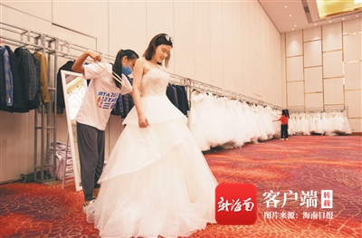 全國戰(zhàn)疫英雄最美婚禮主辦方為新人們精心準(zhǔn)備了全新婚紗。圖為6月5日,參加最美婚禮的新人試穿婚紗。 本版圖片均由海南日報記者 武威 攝