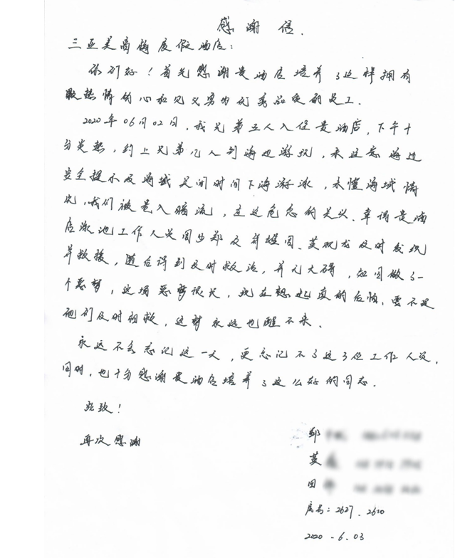 被救后,4名來自江西的游客抱著黃觀龍等人一個勁地道謝地說。離開三亞時,他們給酒店寫了一封感謝信和贈送一面錦旗表達他們由衷的謝意。