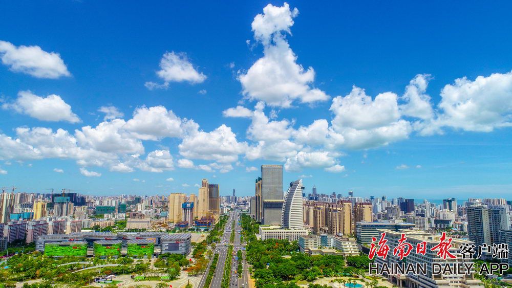 在藍(lán)天白云下,海南日?qǐng)?bào)記者高空航拍夏日里海口萬綠園一帶景色,海口“藍(lán)”美景盡收眼底。