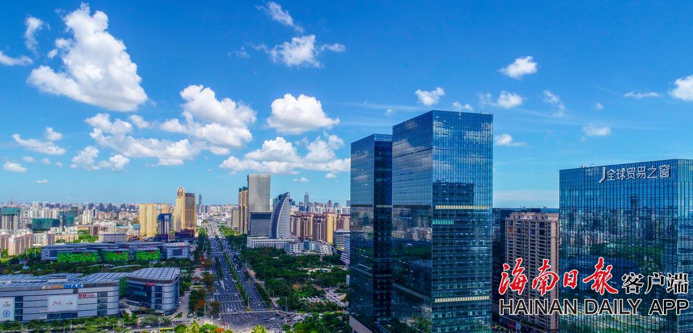 在藍(lán)天白云下,海南日?qǐng)?bào)記者高空航拍夏日里海口國(guó)興大道景色,海口“藍(lán)”美景盡收眼底。