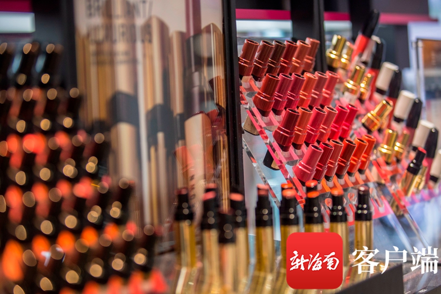 海口日月廣場免稅店,旅客正在挑選口紅。記者 劉洋攝